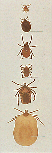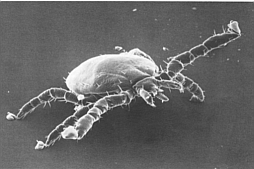 Die Zecke (Ixodes ricinus) ist bei uns heimisch. Auf dem Bild sehen Sie eine junge Nymphe. Sie wird kugelrund und dunkelviolett, wenn sie sich mit Blut vollgesogen hat. Gut sichtbar sind die vorderen Beine, die zu einem perfekten Greif- und Saugapparat ausgebildet sind.